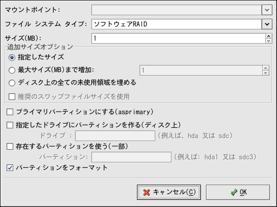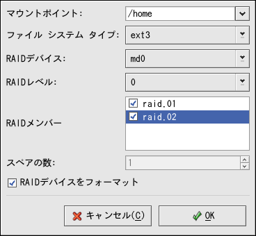 マウントポイント、ファイルシステムタイプ、 RAIDデバイス名、RAIDレベル、RAIDメンバー、 ソフトウェアRAIDデバイス用のスペアの数、 を選択して、RAIDデバイスをフォーマットするかどうか を選択します。