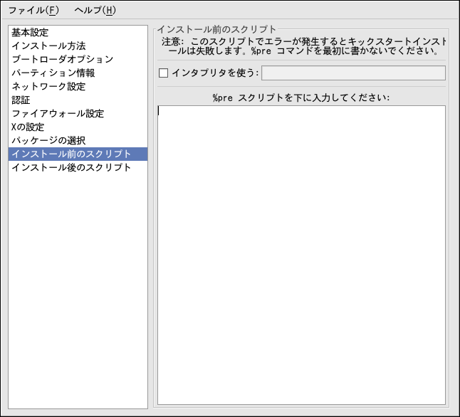 スクリプトを実行するのに使用するスクリプト言語を指定するには、 インタプリタを使うオプションをクリック して、横にあるテキストボックスにインタプリタを入力します。 例えば、/usr/bin/python2.2はPython スクリプト用に指定できます。このオプションは、 キックスタートファイル内の%pre --interpreter /usr/bin/python2.2の 使用に該当します。