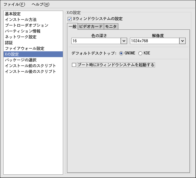 X Window Systemをインストールする場合、キックスタートの インストール中に、図8-11で 示すようにXの設定ウィンドウの X Window System の設定オプションを クリックして設定することができます。このオプションが選択 されていない場合は、X設定オプションは無効になり、 skipxオプションがキックスタートファイル に書き込まれます。