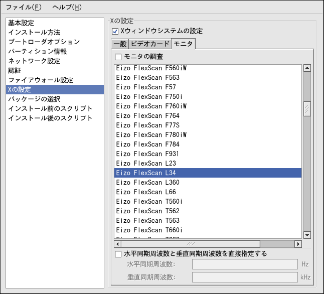 別の方法として、一覧からモニタを選ぶことができます。 モニタの代わりに水平同期と垂直同期を指定 オプションをチェックして、特定モニタを選択 する代わりに水平と垂直の同期率を指定することも できます。このオプションは、システム用のモニタが 一覧にない場合に便利です。このオプションを有効に すると、モニタ一覧は使用できなくなりますので注意 してください。