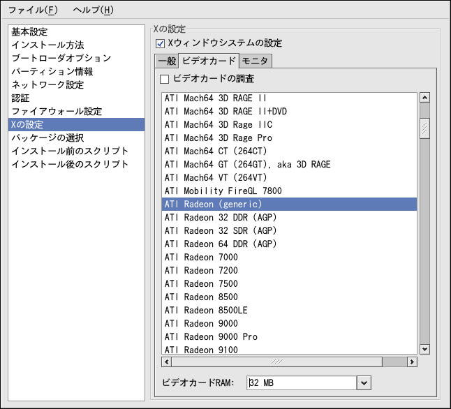 デフォルトではビデオカードの調査が 選択されます。インストール中、インストールプログラムにより ビデオカードを検出するようこのデフォルトのままにします。 最近のビデオカードであればほとんどは検出されます。この オプションを選択し、インストールプログラムがビデオカードを うまく検出できない場合、インストールプログラムはビデオカード 設定画面で停止します。インストールプロセスを続行するには、 一覧からビデオカードを選択し、次を クリックします。