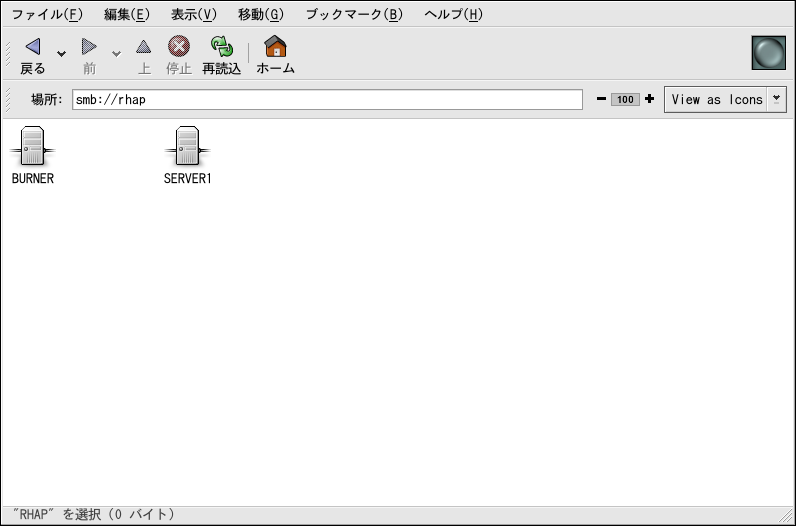図17-7で見ることが出来る様に、ワークグループ内の 各マシン用にアイコンが1つずつあります。どれかアイコンをダブルクリックするとマシン上の Samba共有を表示することが出来ます。ユーザー名とパスワードが必要な場合は、その様に 要求されます。