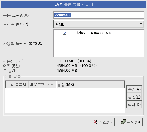 º¼·ý ±×·ì¿¡ ¼ÓÇÑ ¸ðµç ³í¸® º¼·ýÀº ¹°¸®Àû ¹üÀ§ (physical extent) ´ÜÀ§·Î ÇÒ´çµÇ¾î¾ß ÇÕ´Ï´Ù. µðÆúÆ® °ªÀ¸·Î, ¹°¸®Àû ¹üÀ§´Â 4 MB·Î ¼³Á¤µÇ¾î ÀÖ½À´Ï´Ù; µû¶ó¼ ³í¸® º¼·ýÀº 4 MB Å©±â·Î ³ª´©¾îÁ®¾ß ÇÕ´Ï´Ù. ¸¸ÀÏ 4 MB ´ÜÀ§°¡ ¾Æ´Ñ ¿ë·®À» ÀÔ·ÂÇϽøé, ¼³Ä¡ ÇÁ·Î±×·¥Àº ÀÚµ¿À¸·Î 4 MB¿Í °¡Àå ±ÙÁ¢ÇÑ ¿ë·®À» ¼±ÅÃÇÕ´Ï´Ù. ÀÌ ¼³Á¤À» º¯°æÇϽÃÁö ¸¶½Ê½Ã¿À.