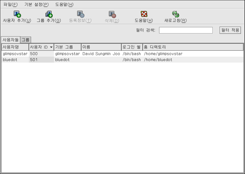 Red Hat Linux´Â 500 ÀÌÇÏÀÇ »ç¿ëÀÚ ID´Â ½Ã½ºÅÛ »ç¿ëÀÚ¸¦ À§ÇØ È®º¸ÇØ µÓ´Ï´Ù. »ç¿ëÀÚ °ü¸® µµ±¸´Â ½Ã½ºÅÛ »ç¿ëÀÚ¸¦ º¸¿©ÁÖÁö ¾Êµµ·Ï ±âº» ¼³Á¤µÇ¾î ÀÖ½À´Ï´Ù. ½Ã½ºÅÛ »ç¿ëÀÚ¸¦ Æ÷ÇÔÇÑ ¸ðµç »ç¿ëÀÚ¸¦ º¸½Ã·Á¸é ±âº» ¼³Á¤ => Ç®´Ù¿î ¸Þ´º¿¡¼ ½Ã½ºÅÛ »ç¿ëÀÚ¿Í ±×·ìµéÀ» °Å¸£±â Ç׸ñÀ» ¼±ÅÃ ÇØÁ¦ÇϽʽÿÀ.