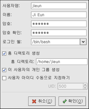 »õ·Î¿î »ç¿ëÀÚÀÇ ID¸¦ Á÷Á¢ ÁöÁ¤Çϱâ À§Çؼ´Â »ç¿ëÀÚ ID ¼öµ¿À¸·Î ÁöÁ¤Çϱâ Ç׸ñÀ» ¼±ÅÃÇÏ½Ã¸é µË´Ï´Ù. ¸¸ÀÏ ÀÌ ¿É¼ÇÀÌ ¼±ÅõÇÁö ¾Ê¾Ò´Ù¸é, ¼ýÀÚ 500 ÀÌÈÄ ´ÙÀ½À¸·Î »ç¿ë °¡´ÉÇÑ ¼ýÀÚ°¡ »ç¿ëÀÚ ID·Î »ç¿ëµË´Ï´Ù. Red Hat Linux¿¡¼ 500 ÀÌÇÏÀÇ »ç¿ëÀÚ ID´Â ½Ã½ºÅÛ »ç¿ëÀÚ ¿ëÀ¸·Î º¸Á¸µË´Ï´Ù.