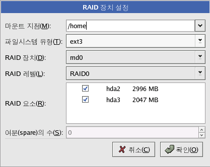 RAID ¼³Á¤¿¡ ÇÊ¿äÇÑ ÆÄƼ¼ÇÀ» ¸ðµÎ »ý¼ºÇÒ ¶§±îÁö ÀÌ·¯ÇÑ °úÁ¤À» °è¼Ó ¹Ýº¹ÇϽʽÿÀ. ¸ðµç ÆÄƼ¼ÇÀÌ RAID ÆÄƼ¼ÇÀÏ ÇÊ¿ä´Â ¾ø½À´Ï´Ù. ¿¹·Î µé¸é, /home ÆÄƼ¼Ç¸¸ ¼ÒÇÁÆ®¿þ¾î RAID ÀåÄ¡·Î ¼³Á¤ÇÏ´Â ¼ö ÀÖ½À´Ï´Ù.