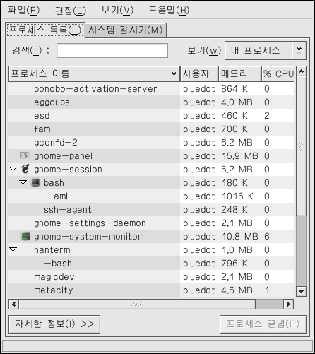±×·¡ÇÈ ÀÎÅÍÆäÀ̽º·Î top ¸í·É °á°ú¸¦ º¸½Ã·Á¸é GNOME ½Ã½ºÅÛ ¸ð´ÏÅ͸¦ »ç¿ëÇϽʽÿÀ. µ¥½ºÅ©Å¾¿¡¼ ½ÃÀÛÇÏ·Á¸é ÆÐ³Î¿¡¼ ¸ÞÀÎ ¸Þ´º ¹öư => ½Ã½ºÅÛ µµ±¸ => ½Ã½ºÅÛ ¸ð´ÏÅ͸¦ ã¾Æ°¡½Ã°Å³ª ¶Ç´Â X À©µµ¿ì ½Ã½ºÅÛ ³»ÀÇ ½© ÇÁ·ÒÇÁÆ®¿¡¼ gnome-system-monitor¶ó°í ÀÔ·ÂÇÏ½Ã¸é µË´Ï´Ù. ±× ÈÄ ÇÁ·Î¼¼½º ¸ñ·Ï ÅÇÀ» Ŭ¸¯ÇϽʽÿÀ.