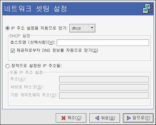 ±×¸² 12-2¿¡¼ º¸¿©Áö´Â ³×Æ®¿öÅ© ¼ÂÆÃ ¼³Á¤ â¿¡¼´Â DHCP¿Í Á¤Àû IP ÁÖ¼Ò Áß Çϳª¸¦ ¼±ÅÃÇØ ÁֽʽÿÀ. ³×Æ®¿öÅ©°¡ ½ÃÀÛµÉ ¶§¸¶´Ù ÀåÄ¡°¡ ´Ù¸¥ IP ÁÖ¼Ò¸¦ ¹Þ´Â´Ù¸é, È£½ºÆ®¸íÀ» ÁöÁ¤ÇÏÁö ¸¶½Ê½Ã¿À. ¾ÕÀ¸·Î ¹öưÀ» Ŭ¸¯ÇÏ¿© °è¼Ó ÁøÇàÇØ ³ª°©´Ï´Ù.