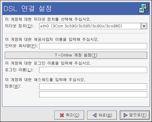 ÀÎÅÍ³Ý È¸»ç¸í, ·Î±×ÀÎ À̸§, ¾ÏÈ£¸¦ ÀÔ·ÂÇϽñ⠹ٶø´Ï´Ù. ¸¸ÀÏ T-Online °èÁ¤À» °¡Áö°í °è½Ã´Ù¸é, ±âº» â¿¡¼ ·Î±×ÀÎ À̸§°ú ¾ÏÈ£¸¦ ÀÔ·ÂÇÏ´Â ´ë½Å, T-Online °èÁ¤ ¼³Á¤ ¹öưÀ» Ŭ¸¯ÇÏ¿© ÇÊ¿äÇÑ Á¤º¸¸¦ ÀÔ·ÂÇØ ÁֽʽÿÀ. ¾ÕÀ¸·Î ¹öưÀ» Ŭ¸¯ÇϽʽÿÀ.