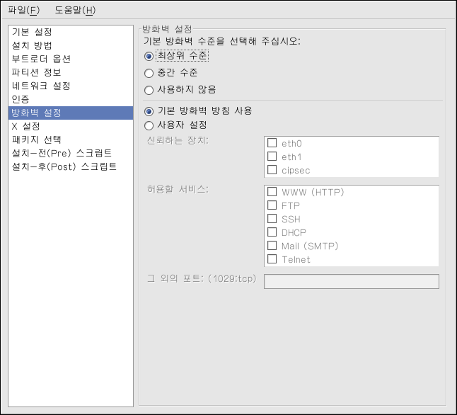 ¹æÈº® ¼³Á¤ âÀº Red Hat Linux ¼³Ä¡ ÇÁ·Î±×·¥°ú º¸¾È ¼öÁØ ¼³Á¤ µµ±¸¿¡¼ ³ªÅ¸³ª´Â â°ú ¶È°°À¸¸ç µ¿ÀÏÇÑ ±â´É¼ºÀ» Á¦°øÇÕ´Ï´Ù. ÃÖ»óÀ§, Áß°£, »ç¿ëÇÏÁö ¾ÊÀ½ º¸¾È ¼öÁØ Áß Çϳª¸¦ ¼±ÅÃÇϽʽÿÀ. ÀÌ·¯ÇÑ º¸¾È ¼öÁØ¿¡ ´ëÇÑ º¸´Ù ÀÚ¼¼ÇÑ Á¤º¸¸¦ ¿øÇϽŴٸé 13.1 ÀýÀ» ÂüÁ¶ÇϽñ⠹ٶø´Ï´Ù.