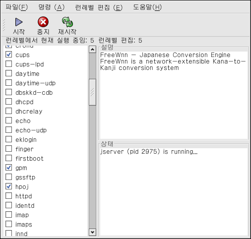 xinetd ¼ºñ½º°¡ ¾Æ´Ñ ¼ºñ½º¸¦ Ȱ¼ºÈÇÏ¿© ÇöÀç ¼±ÅÃµÈ ·±·¹º§¿¡¼ ºÎÆÃ½Ã ½ÃÀ۵ǵµ·Ï ÇϽ÷Á¸é, ¸ñ·Ï¿¡¼ ÇØ´ç ¼ºñ½º À̸§ ¿·¿¡ À§Ä¡ÇÑ Ã¼Å©¹Ú½º¸¦ üũÇϽñ⠹ٶø´Ï´Ù. ·±·¹º§À» ¼³Á¤ÇϽŠÈÄ, Ç® ´Ù¿î ¸Þ´º¿¡¼ ÆÄÀÏ => º¯µ¿ »çÇ× ÀúÀå Ç׸ñÀ» ¼±ÅÃÇÏ¿© º¯°æ »çÇ×À» Àû¿ëÇϽñ⠹ٶø´Ï´Ù. ·±·¹º§ ¼³Á¤Àº º¯°æµÇ¾úÁö¸¸, ·±·¹º§À» Àç½ÃÀÛÇÏÁö ¾Ê½À´Ï´Ù; µû¶ó¼ º¯°æ »çÇ×ÀÌ Áï½Ã Àû¿ëµÇÁö ¾Ê½À´Ï´Ù.