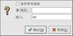 点击「添加」按钮来定义接受请求的其它端口。 一个如图 19-2所示的窗口会出现。你可以选择「监听所有地址」选项来在定义的端口上监听所有 IP 地址,也可以在「地址」字段中指定服务器会接受请求的地址。每个端口只能指定一个 IP 地址。如果你想在同一端口号码上指定多个 IP 地址,请为每个 IP 地址分别创建条目。如果有可能,使用 IP 地址而不是域名,这样会避免 DNS 查寻失败。详情请参阅http://httpd.apache.org/docs-2.0/dns-caveats.html 中的 Issues Regarding DNS and Apache。
