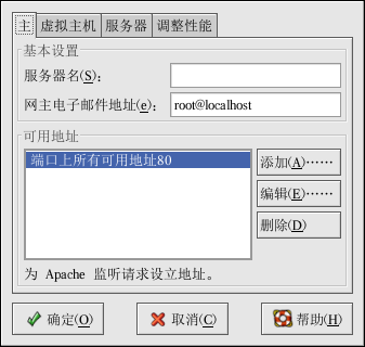 HTTP 配置工具允许你为 Apache HTTP 服务器 配置 /etc/httpd/conf/httpd.conf 配置文件。它不使用旧的 srm.conf 或 access.conf 配置文件;把它们留为空白。你可以通过图形化界面来配置指令,例如虚拟主机、记录属性和最大数量连接等。