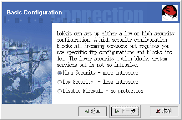 「Low Security」 — 该选项将不会允许到系统的远程连接,包括 NFS 连接和远程 X 窗口系统会话。在端口 1023 之下运行的服务将不会接受连接,包括 FTP、SSH、Telnet、以及 HTTP。