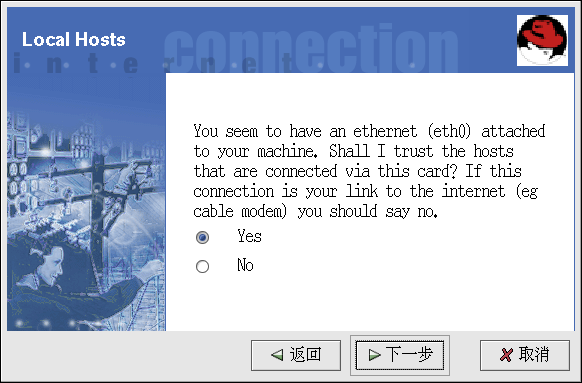 如果系统上有以太网设备,「Local Hosts」页会允许你配置防火墙规则是否要应用到发送给每个设备的连接请求。如果该设备把系统连接到防火墙后的局域网,并不直接连接到互联网,选择「Yes」。如果该以太网卡把系统连接到电缆或 DSL 调制解调器,我们提议你选择「No」。