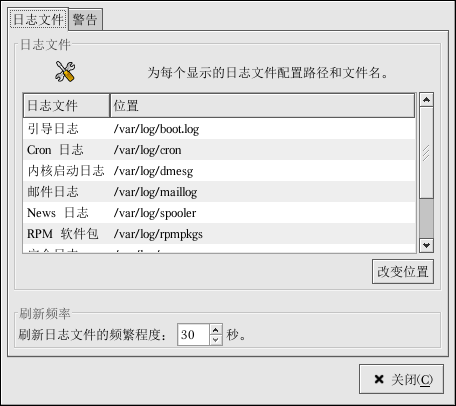 这个应用程序只能显示存在的日志文件;因此,其列表可能会与图 29-1所示的略有不同。要查看它能够查看的完整日志列表,请参见配置文件 /etc/sysconfig/redhat-logviewer。
