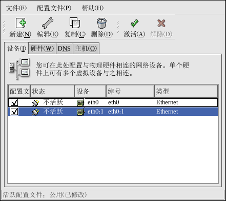 图 12-20显示了 eth0 设备的一个别名。注意 eth0:1 设备 — eth0 的第一个别名。eth0 的第二个别名的设备名会是 eth0:2,依此类推。要修改设备别名的设置,如是否要在引导时激活,或别名号码,从列表中选择它,然后点击「编辑」按钮。