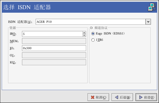 从下拉菜单中选择 ISDN 适配器。然后为该适配器配置资源和 D 频道协议。点击「前进」来继续。