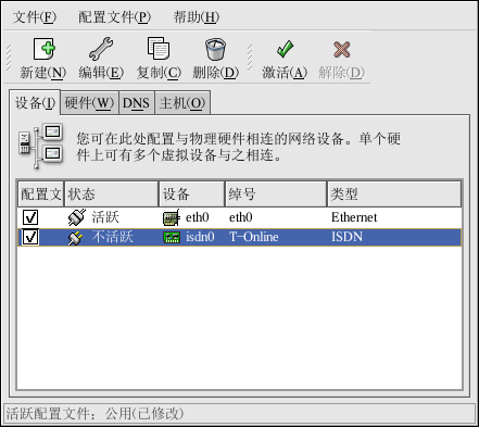 添加了 ISDN 设备后,你可以从设备列表中选择它,然后点击「编辑」来编辑它的配置。譬如,当某设备被添加,它被默认配置成引导时启动。你可以编辑它的配置来修改这项设置。压缩、PPP 选项、登录名、口令等等都可以被改变。