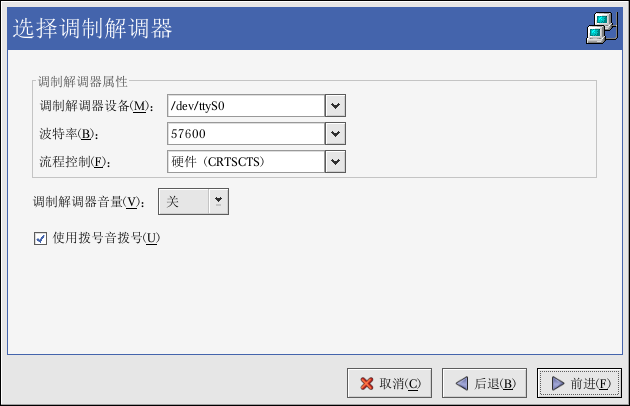 配置调制解调器、波特率、流控制、以及调制解调器音量。如果你不知道这些值,但是调制解调器被成功地探测到,则接受默认值。如果你没有按键式电话连线方式,取消选择相应的复选箱。点击「前进」。