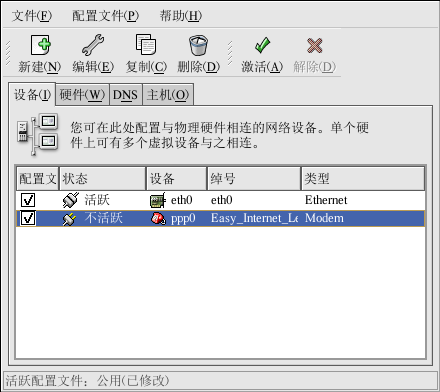 添加了调制解调器设备后,你可以从设备列表中选择它,然后点击「编辑」来编辑它的配置。譬如,当某设备被添加,它被默认配置成引导时启动。你可以编辑它的配置来修改这项设置。压缩、PPP 选项、登录名、口令等等都可以被改变。