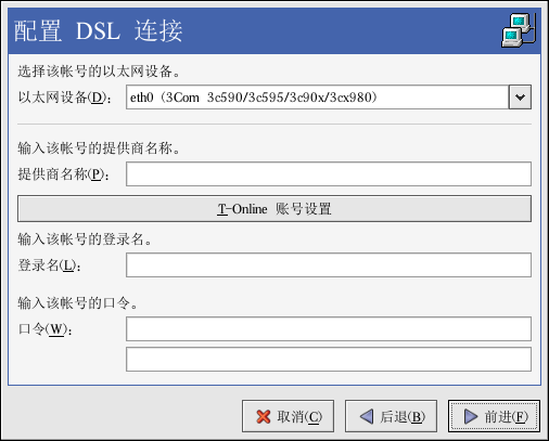 输入「提供商名称」、「登录名」、和「口令」。如果你有一个 T-Online 账号,与其在默认窗口中输入「登录名」和「口令」,你可以点击「T-Online 账号设置」按钮,并输入所需信息。点击「前进」来继续。