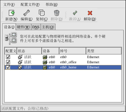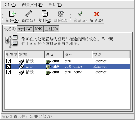 在设备列表中,有一列被标为「配置文件」的复选箱。对每个配置文件,你都可以选择或取消选择 设备。只选择被包括在当前选中配置文件中的设备。例如,如果你在一个叫做 Office 的配置文件中创建了一个叫做 eth0_office 的逻辑设备,并想在该配置文件被选时激活这个逻辑设备,取消选择 eth0 设备,选择 eth0_office 设备。