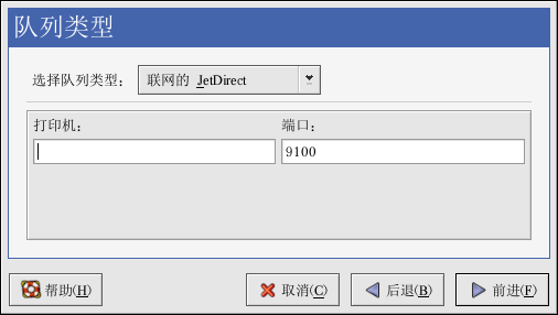 从「选择队列类型」菜单中选择「联网的 JetDirect」,然后点击「前进」。