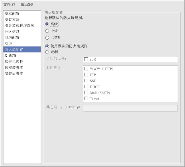 「防火墙配置」窗口与 Red Hat Linux 安装程序和 安全级别配置工具中的屏幕一模一样。在「高级」、「中级」和「已禁用」这些级别中选择。关于这些安全级别的详细信息,请参阅第 13.1 节。