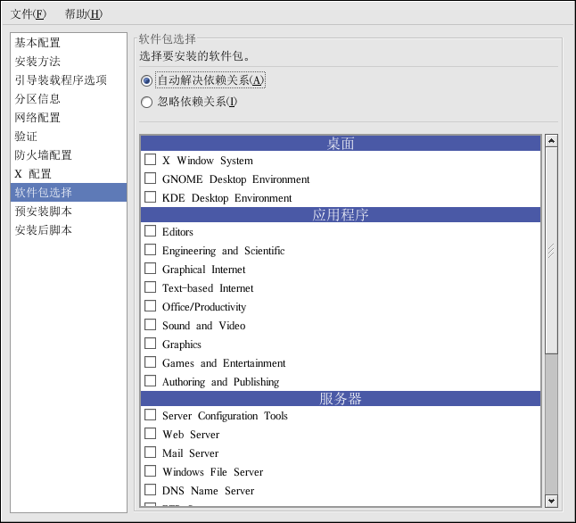 目前,Kickstart 配置器 不允许你选择单个软件包。要安装单个软件包,在你保存了 kickstart 文件后,修改其中的 %packages 部分。详情请参阅第 7.5 节。