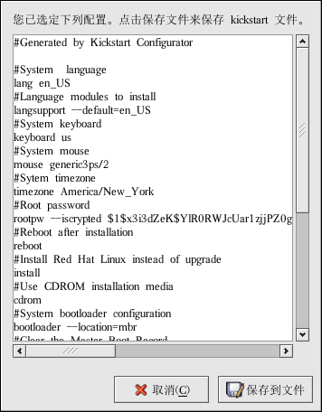 要保存 kickstart 文件,点击预览窗口中的「保存到文件」按钮。要不预览而保存文件,选择「文件」 => 「保存文件」或按 [Ctrl]-[S]。一个对话框会出现。选择要保存文件的位置。