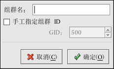 要添加新用户组群,点击「添加组群」 按钮。一个类似图 25-4的窗口就会出现。键入新组群的名称来创建。要为新组群指定组群 ID,选择「手工指定组群 ID」,然后选择 GID。Red Hat Linux 把 低于 500 的组群 ID 保留给系统组群。