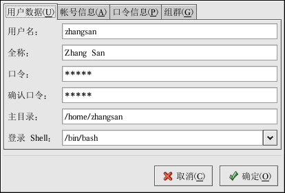 「用户数据」 — 显示在你添加用户时配置的基本用户信息。使用这个标签来改变用户的全称、口令、主目录或登录 shell。