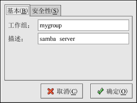 在「基本」标签上,指定计算机应在的工作组以及对计算机的简短描述。它们与 smb.conf 中的 workgroup 和 server string 选项相对应。