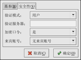 如果用户在 Windows 机器上有一个不同的用户名,并将从 Windows 机器上登录入 Samba 服务器,请在「Windows 用户名」字段中指定 Windows 用户名。「服务器设置」首选项的「安全」活页上的「验证模式」 必须被设置为「用户」才能是这个选项生效。
