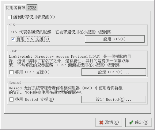 啟用 NIS 支援 — 選取這個選項以設定系統為連線到 NIS 伺服器以取得使用者與密碼認證的一部 NIS 用戶端。 點選 設定 NIS 按鈕以指定 NIS 網域與 NIS 伺服器。 假如在此沒有指定 NIS 伺服器,系統程式將會試著以廣播的方式進行搜尋。