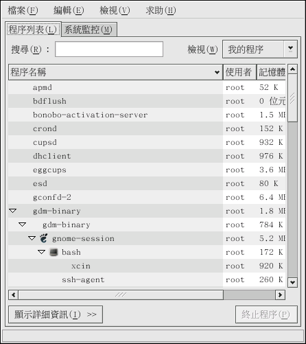 假如您較喜歡 top 的一個圖形化介面,您可以使用 『GNOME 系統監控』。 如要從桌面啟動它,請選擇面板上的 『主選單按鈕』 => 『系統工具』 => 『系統監控』,或是在 X 視窗系統下的 shell 提示符號輸入 gnome-system-monitor 指令。 然後選擇 『程序列表』 的標簽頁。