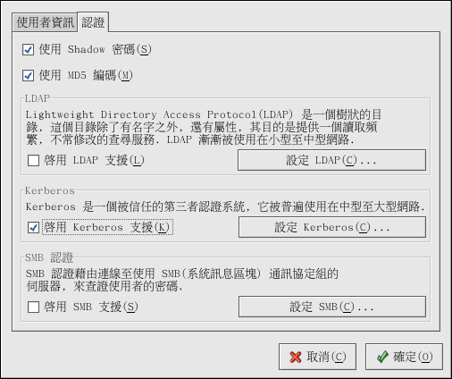 必須安裝 krb5-libs 與 krb5-workstation 套件才能使用這個選項。 請參考 Red Hat Linux 參考手冊 以取得關於 Kerberos 的更多資訊。