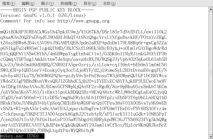 現在,mykey.asc 檔案就可以被放入電子郵件或匯出到一部金鑰伺服器上。 如要讀取這個金鑰的內容,請輸入 less mykey.asc 以在頁面調度程式(pager)中開啟該檔案(按下