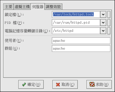『伺服器』 的標簽頁中可以讓您配置基本的伺服器設定,這些選項的預設設定可適用於大部分的狀況。
