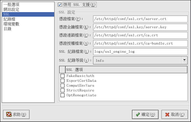 假如一個 Apache HTTP 伺服器 並沒有設定含有 SSL 支援,在一部 Apache HTTP 伺服器 與它的用戶端之間的連線通訊都是沒有經過加密的。 這在不含有個人或機密資訊的網站上是比較沒有太大關係的。 舉例來說,一個用來散佈開放原始碼軟體與說明文件的開放原始碼網站是不需要安全連線的。 然而一個需要顧客輸入信用卡資訊的電子商務網站,便應該要使用 Apache 的 SSL 之原來對其通訊進行加密處理。 啟用 Apache 的 SSL 支援將啟用 mod_ssl 安全模組的使用。 如要透過 HTTP 設定工具 來啟用它,您必須在 『主要』標簽頁 => 『可使用的位址』 中允許透過埠號 443 的存取。 請參考 菴 19.1 節 以得到更多資訊。 然後在 『虛擬主機』 的標簽頁選取虛擬主機的名稱,再點選 編輯 的按鈕,從左邊的選單選取 『SSL』,然後選取如 圖形 19-9 所示的 『啟用 SSL 支援』 選項。 『SSL 設定』 的部份已經預先設定好虛設的數位憑證,這個數位憑證為您的安全網頁伺服器提供認證,並使得用戶端的網頁瀏覽器能夠辨識這部安全伺服器。 您必須購買您自己的數位憑證,請勿在您的網站使用 Red Hat Linux 所提供之虛假的數位憑證。 如需關於購買一個 CA 認證的數位憑證的詳細資訊,請參考 第20章 。