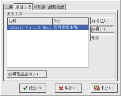 如要新增一個虛擬主機,請點選 『虛擬主機』 標簽頁中的 新增 按鈕。 您也可以在清單中選取一個您要修改的虛擬主機,再點選 編輯 的按鈕,來修改一個虛擬主機的設定。