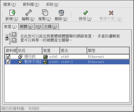 圖形 12-20 顯示含有一個別名的 eth0 裝置的例子,請注意 eth0:1 裝置 — 為 eth0 裝置的第一個別名; 而第二個別名則是 eth0:2,依此類推。 如要修改裝置別名的設定,例如是否要在開機時啟動它以及別名號碼等,請從清單中選取它,再點選 編輯 按鈕。