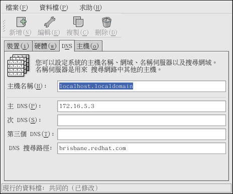 在 DNS 的標簽頁中,您可以設定系統的主機名稱、網域、名稱伺服器以及搜尋路徑。 名稱伺服器是用來尋找網路上的其他主機。