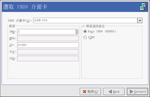 從下拉式選單中選取 ISDN 介面卡,然後為該介面卡設定資源以及 D 頻道通訊協定。 再點選 下一步 繼續。