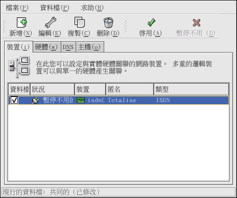 在新增完 ISDN 裝置後,您可以從裝置清單中選取它,再點選 編輯 的按鈕來修改它的設定。 例如,當新增裝置後,它是預設設定在開機時不啟動。 請編輯它的組態設定以修改這個設定。 您也可以更改壓縮、PPP 選項、登入名稱、密碼等等。