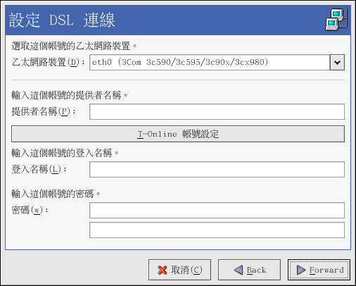 請輸入 『提供者名稱』、『登入名稱』 以及 『密碼』。 假如您擁有一個 T-Online 的帳號,請勿在預設視窗中輸入 『登入名稱』 與 『密碼』,請點選 T-Online 帳號設定 的按鈕,在輸入需要的資訊。 點選 下一步 繼續。