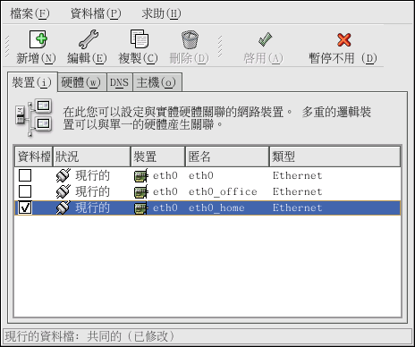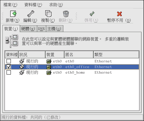 在裝置清單中,有一個標示為 『資料檔』 的欄位,對於每一個資料檔,您可以選取或取消選取裝置。 只有選取的裝置會被含括在目前選取之資料檔中,舉例來說,假如您在一個稱為 Office 的資料檔中建立一個稱為 eth0_office 的邏輯裝置,而您想要在該資料檔被選取時啟動該邏輯裝置,請取消選取 eth0 裝置,並選取 eth0_office 裝置。