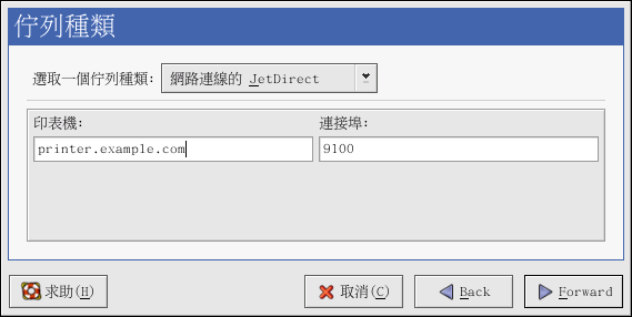 請從 『選取一個佇列種類』 的選單中選擇 『網路連線的 JetDirect』,再點選 下一步。