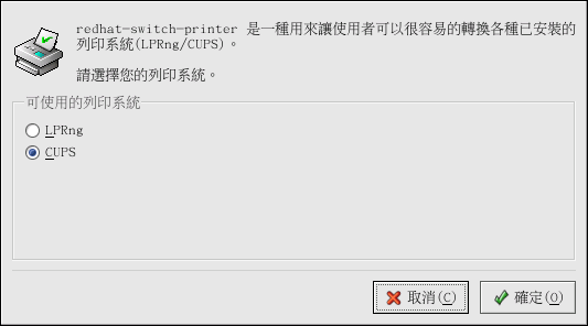 您可以選取 LPRng 或 CUPS 列印系統。 在 Red Hat Linux 9 中,CUPS 為預設值。 假如您只安裝一種列印系統,這裡只會顯示這個選項(CUPS)。